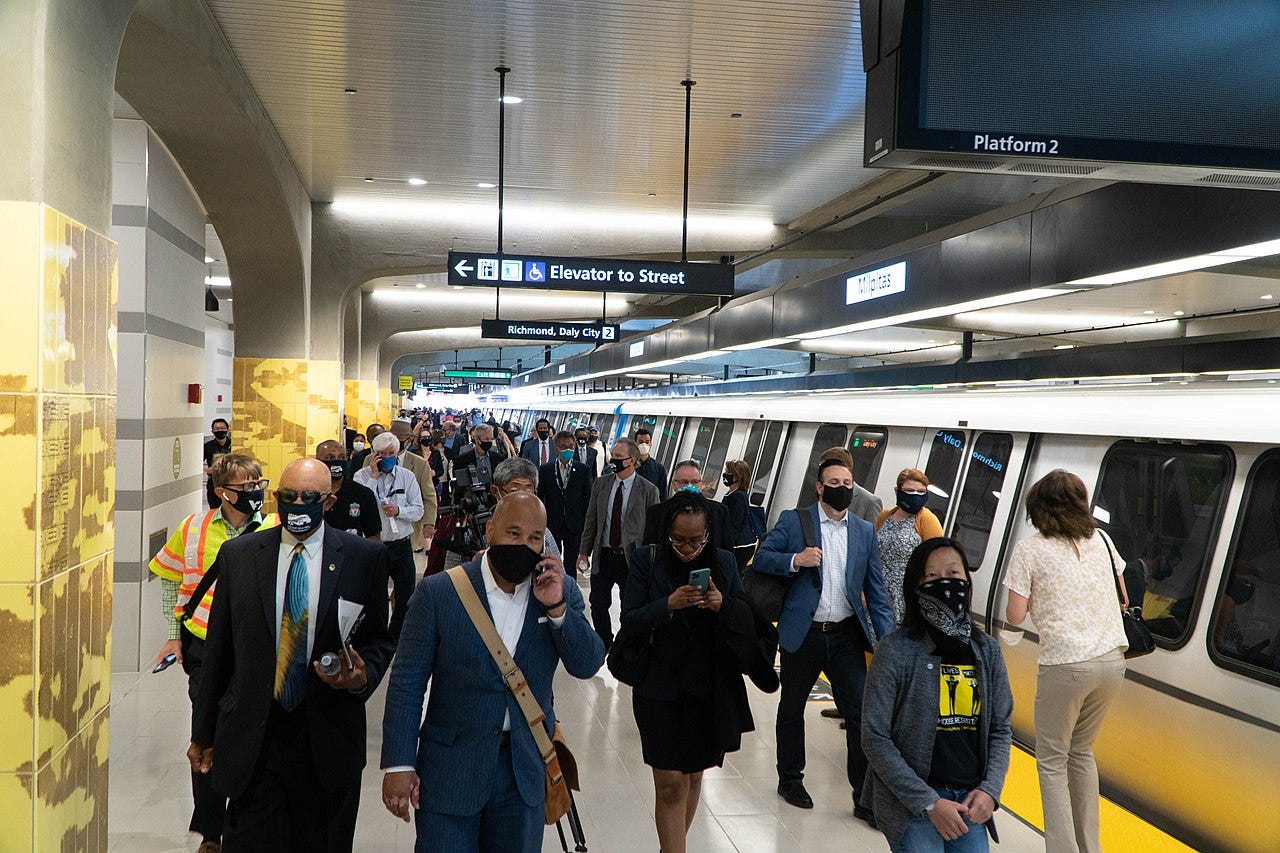 A crowd of Bay Area Rapid Transit riders in June 2020 following CDC face mask guidelines at Milpitas station in Milpitas, California. (Source: Wikipedia)