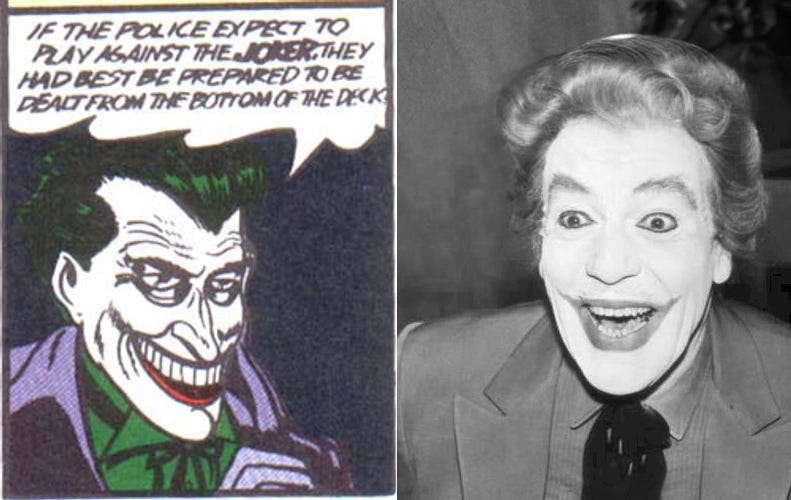 The “clown prince of crime” has always changed over time. Earlier versions of The Joker in comic-books were alternately frightening and ridiculous. The family-friendly, “camp” incarnation of 1960s television gave way to the sadistic psychopath of the 1980s. (The 1940s version could also be quite sinister.) The Joker’s origins are not only in clowning. He was also inspired by Victor Hugo’s story “The Man Who Laughs” (1869) — about a disfigured man who is doomed to always grin. (A case of the mask becoming the man.)