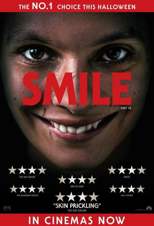 SMILE (2022): In this movie, the unfunny scary clown has found its final form. It’s about a supernatural menace that turns its victims into a demonic clownface — with echoes of THE MAN WHO LAUGHS, and of course The Joker. I tried watching and couldn’t finish; it was neither funny nor particularly scary. SMILE clearly wants to be IT FOLLOWS (2014) — but IT FOLLOWS is the far superior movie.