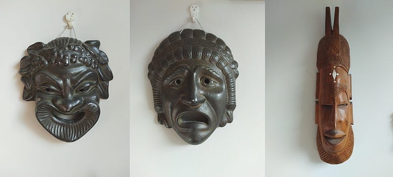 So why did Western culture use ritual masks and clownface much less than usual for a long time? Stage theater included painted faces and masks well into the Renaissance, and the forms lingered in some corners — such as British Christmas panto, Italian Commedia dell'arte, and of course circus clowns. But “serious” Western theater stopped using masks, painted faces were replaced by naturalistic makeup, and the highest ideal for actors became to perform an “authentic” face that expressed “real” inner feelings.